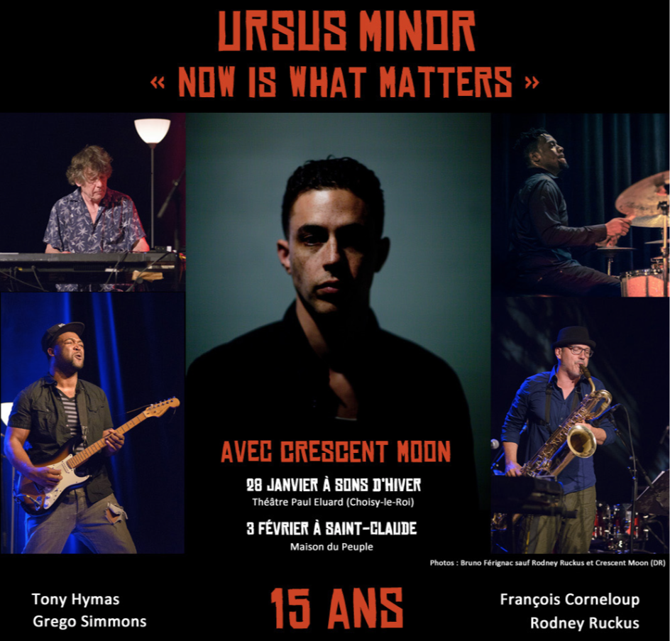 Après un très remarqué quatrième opus, le double album What matters now (sorti fin 2016), Ursus Minor revient sur une des ses scènes essentielles, celle de Sons d'Hiver qui l'a vu naître deux beaux jours de janvier 2003. A quatre autres reprises, la petite constellations a pu y faire entendre ses marques présentes jusqu'à sons salut à Howard Zinn en 2012. What matters now ou "la preuve par neuf qu'avec free, énergie, rap, présence et idée forte, on peut tenir bon la barre de la révolution" écrivait Francis Marmande dans Le Monde du 30 décembre 2016. Lors de ce retour à Sons d'Hiver ce 28 janvier 2018, le quartet devenu pleinement quintet avec, nouvel arrivant, le rappeur-chanteur Crescent Moon (du groupe Kill the Vultures) insistera en une sorte de Now is what matters, étape naissante d'un groupe en constant mouvement avec un répertoire entièrement renouvelé nourri des crépitements du monde.