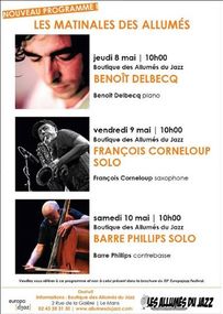 Les Allumés du Jazz organisent pendant l'Europa trois matinées les 8, 9 et 10 mai avec les musiciens suivants : Benoît Delbecq, François Corneloup et Barre Phillips.