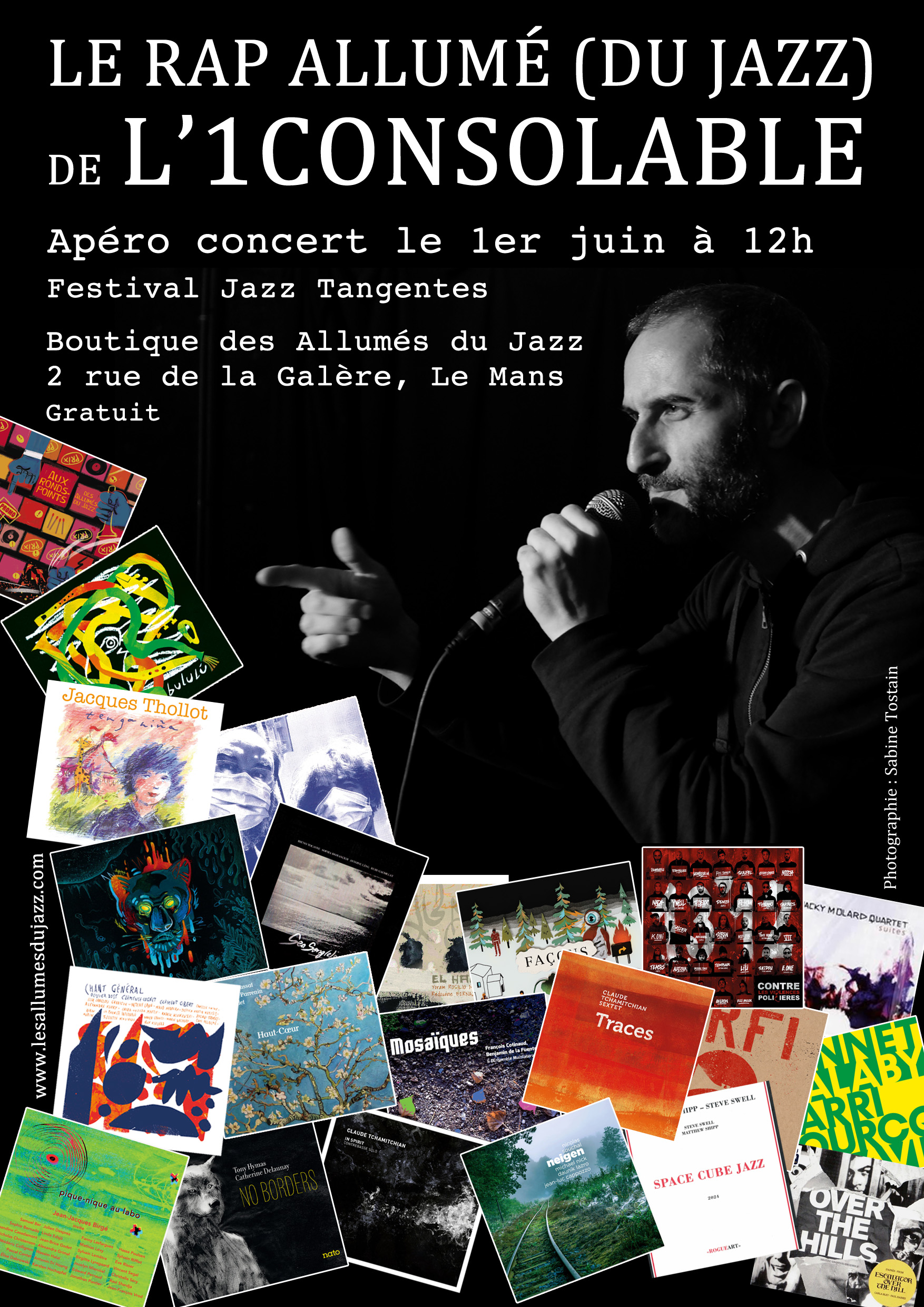 L'1consolable, également beatmaker de son état, a en effet confectionné les séquences musicales sur lesquelles il rappera en ponctionnant dans les productions de ces labels, et avec leur aimable autorisation, différents échantillons sonores. Découpés et mis en boucle, utilisés tels quels ou réagencés, ils seront la matière constitutive de la musique qui sera jouée ce 1er juin au Mans. Une manière de salut aux musiques que les Allumés du Jazz défendent, à celles et ceux qui les composent et de rappeler, aussi, combien la musique est le fruit d'une histoire au long cours, collective et politique.
