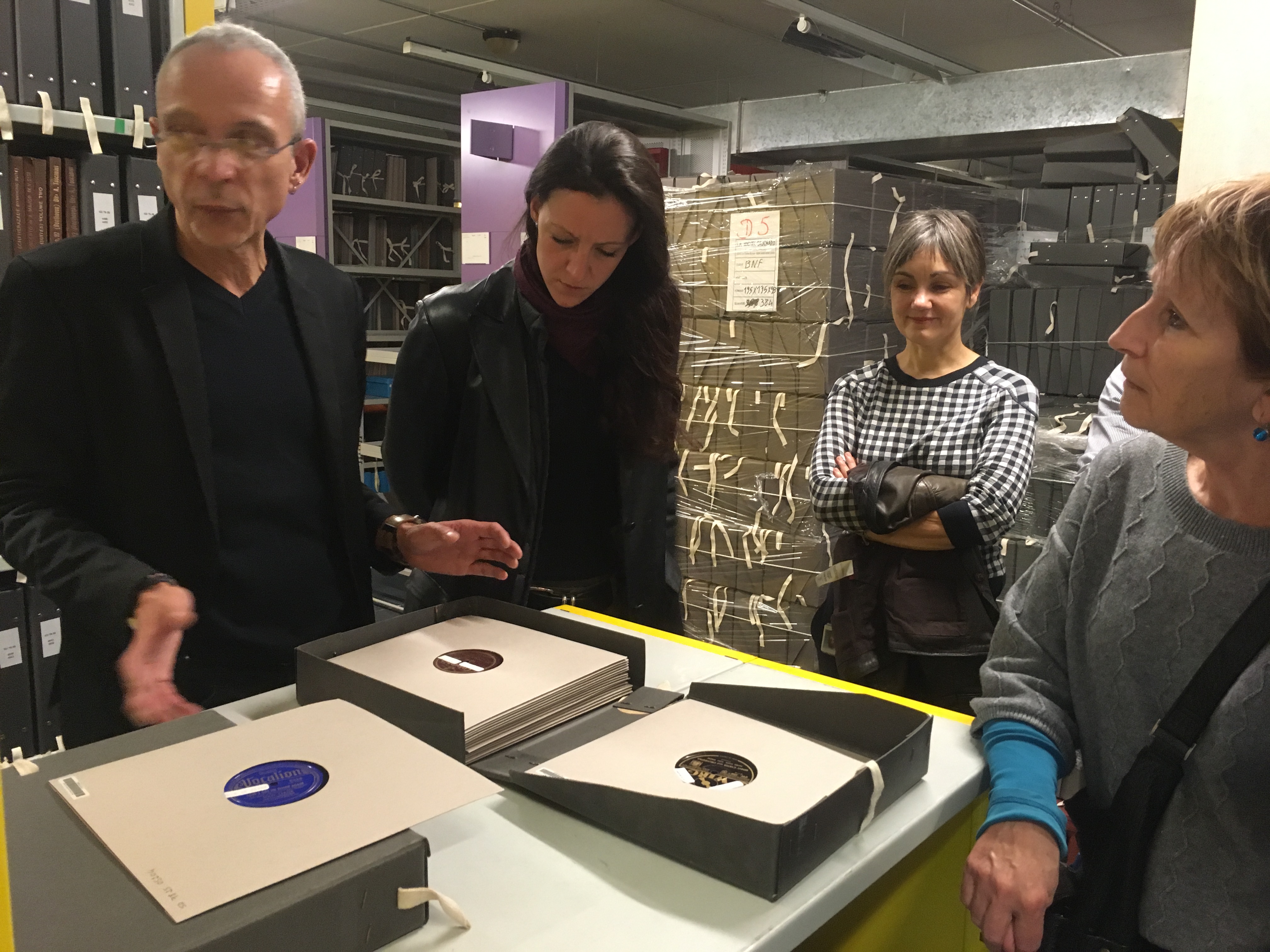 Le département audiovisuel de la BnF a reçu les Allumés du Jazz ce dernier lundi 6 novembre, pour une visite de ses trésors collectés et amoureusement conservés, avec un accès privilégié là où, hormis le personnel, nul ne va. Nous y avons croisé entre autres, les robots distributeurs des documents qui sillonnent tout le bâtiment. Outre les méthodes d'archivage et conservation, et la visite de quelques kilomètres de rayonnages (il n'y manquait que le ronronnement des moteurs d'un navire...) Pierre Bonneau, Catherine Lamarre, et (.... nom à préciser, j'attends que catherine me le redonne) nous ont exposé, avec quelque fierté toute légitime, des coffrets d'albums absolument incroyables. Des millions de documents à faire pâlir tous les amoureux de la musique, et un outil fabuleux à disposition de tous.
