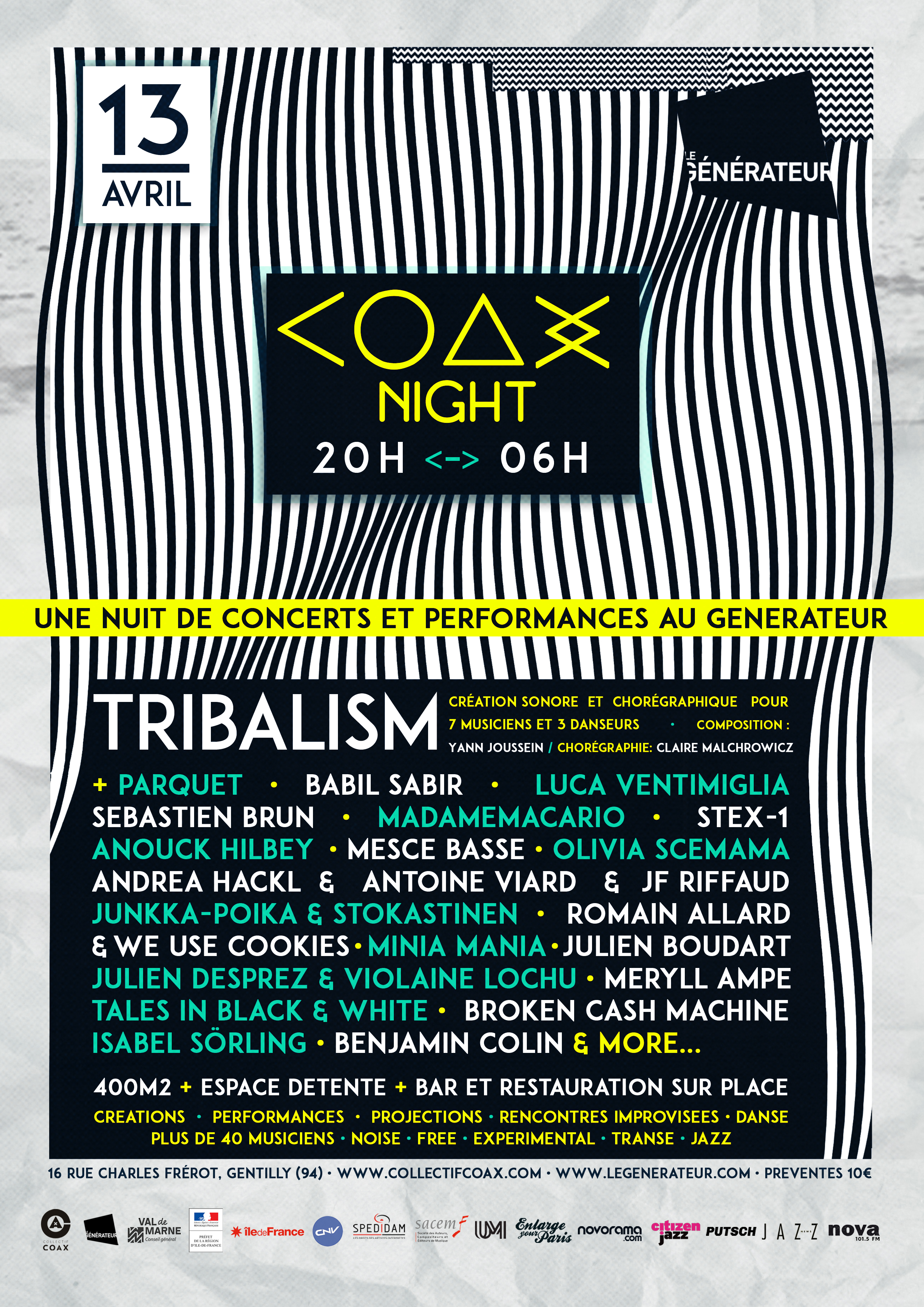 Dans le cadre de sa nouvelle création Tribalism, le collectif Coax organise sa première Coax Night pour une nuit blanche de concerts, performances sonores, vidéos et chorégraphiques. Un vendredi 13 pas commes les autres, ou créations, compositions, improvisations et autres déambulations d'approprieront les 400m2 du Générateur (94) jusqu'au petit matin.