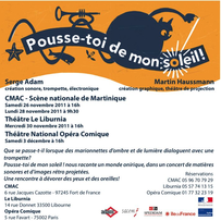 Performance musicale et graphique, Pousse-toi de mon soleil ! réunit le compositeur et trompettiste français Serge Adam et le plasticien allemand Martin Haussmann.
