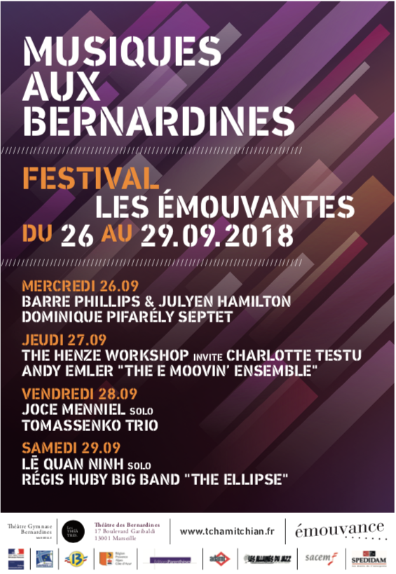 Cette 6ème édition du festival « Les émouvantes » vous propose de découvrir plusieurs artistes qui travaillent sur la poétique de cette dynamique. Quand le mouvement est à la base de l’inspiration (« Anabasis » Dominique Pifarely ou « The Ellipse » Régis Huby), quand il opère un jeu de miroir entre deux visions d’une même écriture (« The Henze Worshop » Charlotte Testu et Stéphane Payen), quand il est à la base d’un dialogue corps/musique (Barre Phillips et Julyenn Hamilton) ou qu’il génère une douceur faite de mots, de sons et de silence (« Daisy Tambours » Olivier Thomas); quand entendre devient ce qui fait disparaître tout pré-entendement, libérant l’écoute (“Autour de John Cage » Le Quan Ninh solo), ou bien nous transporte dans une forêt sublimée, urbaine et naturelle (« Dans la Forêt » Joce Menniel solo). Enfin quand cette « poétique du mouvement » est la source même d’une commande d’oeuvre passée à Andy Emler ( » The E-Moovin Ensemble ») qui sera créée lors du festival.